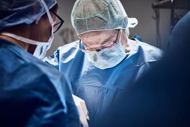 Chirurgisches Team, das in OP-Kleidung bei einer Operation konzentriert arbeitet, mit Fokus auf eine Person, die sich über den Patienten beugt.