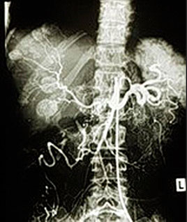 Abb.1: Angiokatheter im Truncus coeliacus zur regionalen Chemotherapie von Lebermetastasen eines Dünndarmkarzinoids. Diese Metastasen sind so gut vaskularisiert, dass sie sich mit dem arteriell applizierten Kontrastmittel darstellen lassen.